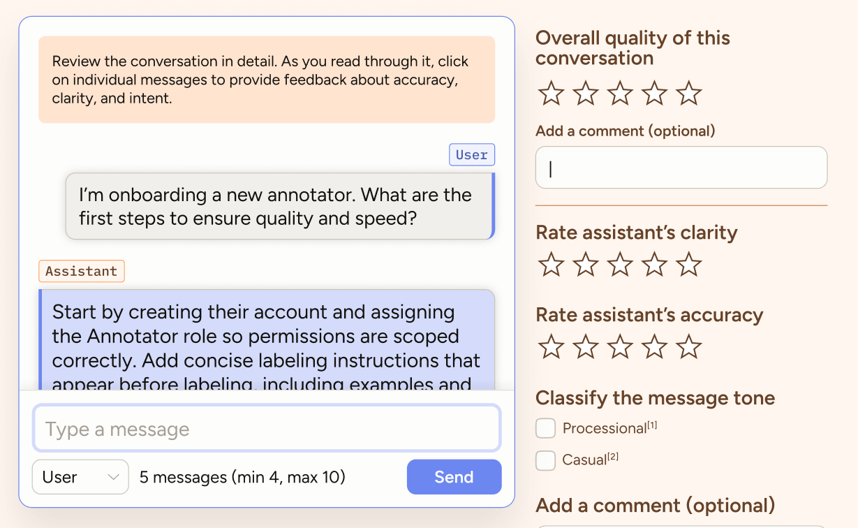 For per-message evaluation, an annotator must click on a message in the chat interface. And then options specific to that role appear on the right.