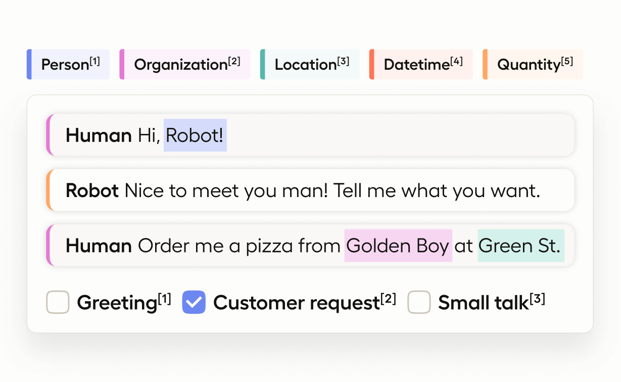 Use this template to provide a section of dialogue, assign labels to spans of text in the dialogue, and classify the intent of the dialogue.