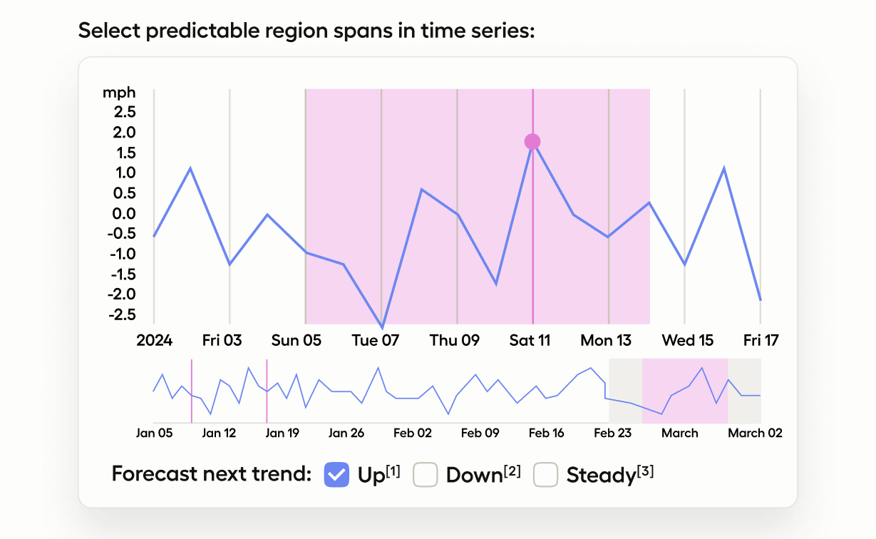 The valueType="url" parameter means that Label Studio expects links to CSV files in JSON-formatted tasks. The timeColumn parameter specifies the column in your dataset to use as the X-axis for time. If you don’t specify a timeColumn, Label Studio uses incremental integer values as the X-axis: 0, 1, 2, ....